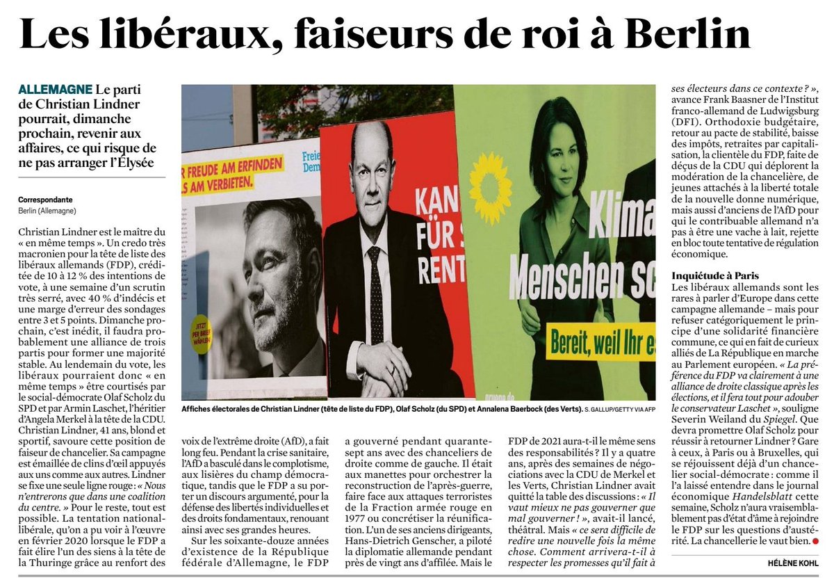 De gauche à droite Olaf Scholz ministre des Finances et vice-chancelier social-démocrate candidat du SPD Annalena Baerbock cheffe de file et candidate des Verts et Armin Laschet. Le SPD avec 206 députés pourrait ainsi sallier avec les Verts arrivés troisième du scrutin avec 148 118 députés et les libéraux du FDP un parti de droite qui a recueilli.